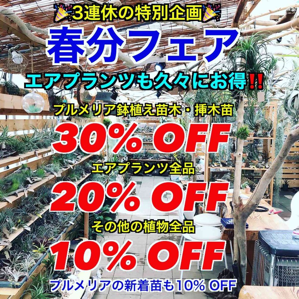 農園では3連休限定でエアプランツも久しぶりに20%オフ、プルメリア苗木とカット苗は30%オフ、その他の南国植物や新着プルメリア苗も10%オフになる春分フェアを開催中です🎉