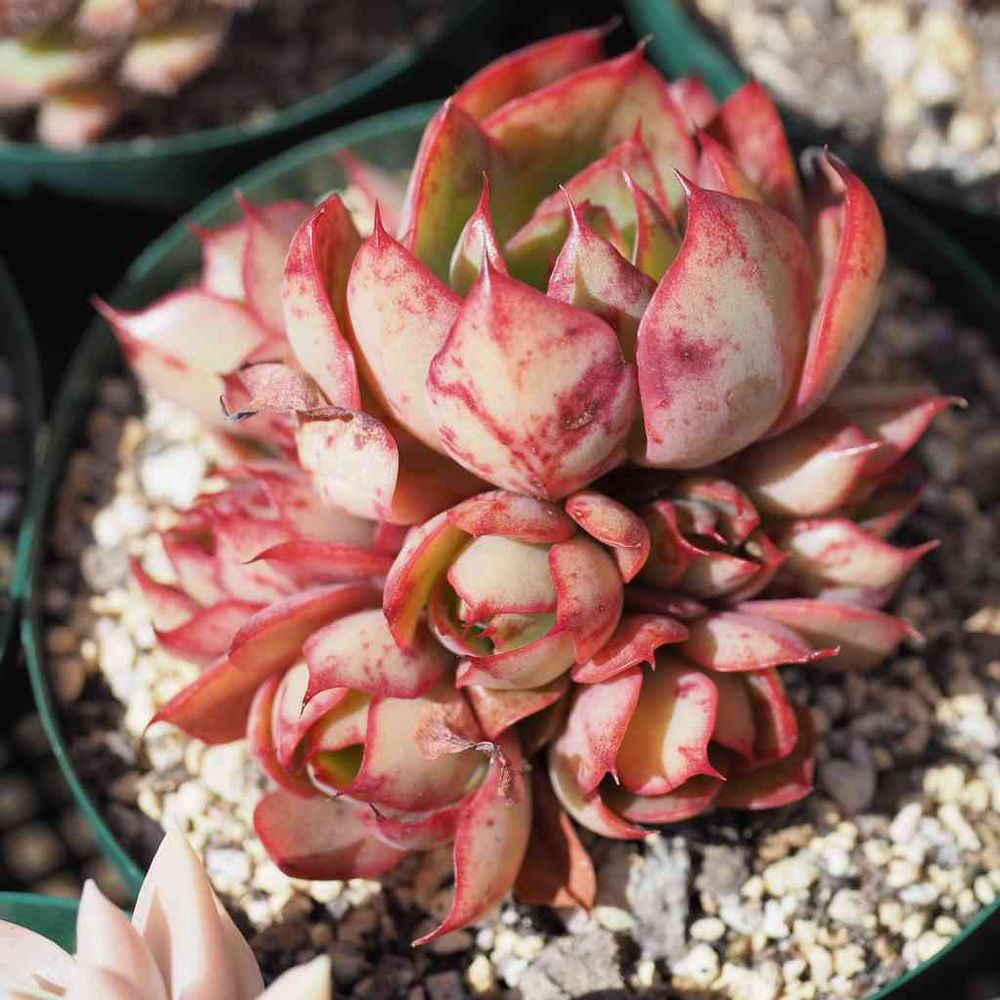 この ヤンジン というエケベリア、すごく好みなの。うちに来て、もうすぐ2年。子株は外さずに、大きい鉢に植え替えたい。