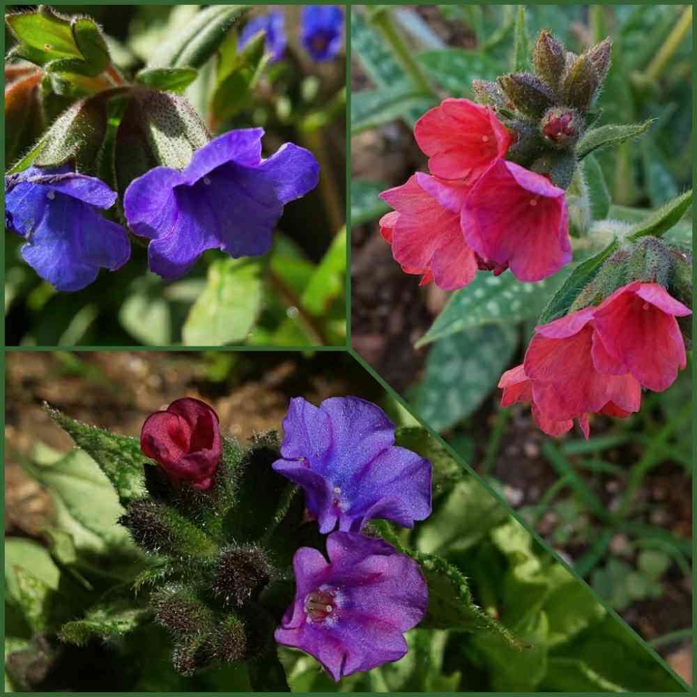 斑点の入った葉に赤系の花のコーラルスプリング、シルバーリーフに紫~ピンクの花のマジェスティ、ブルー系の花のブルーエンサイン。常緑の明るい葉も変化する花の色も楽しめる大好きなお花🌿