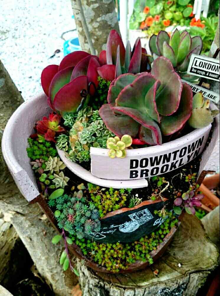 割れ鉢に寄せ植え良いですねぇ。