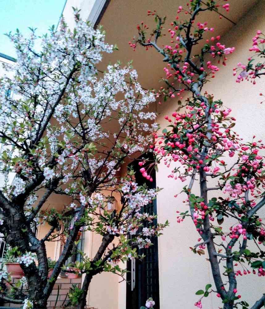 仕事の帰り道に、カイドウとユスラウメの花が綺麗でした。