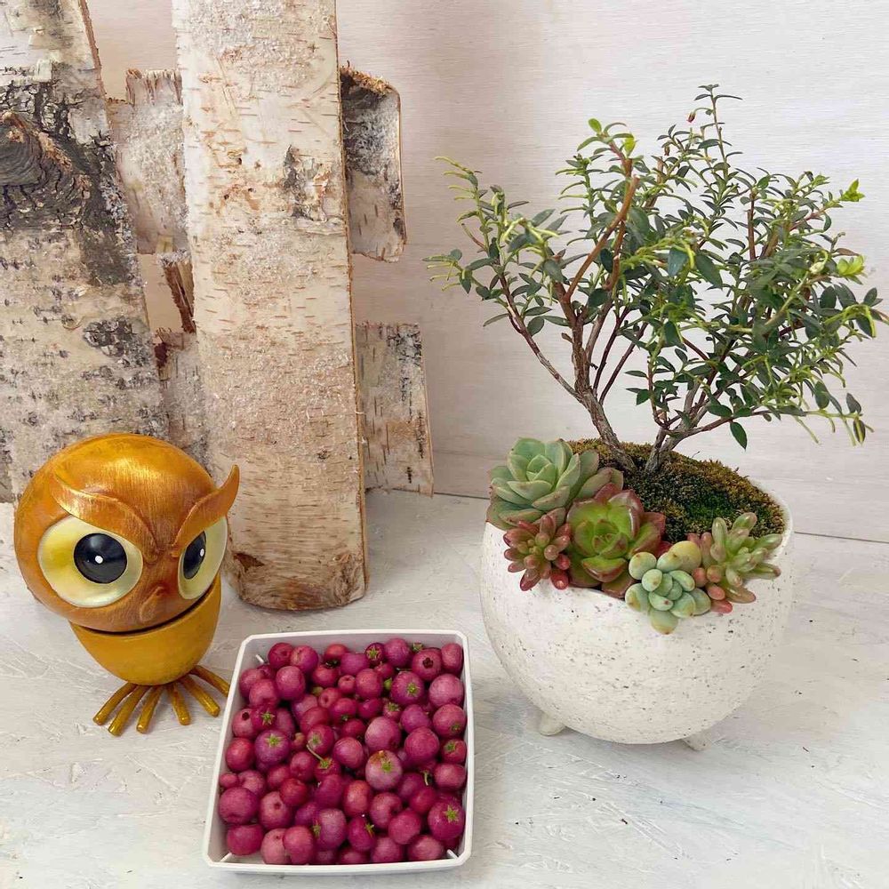ハッピーベリーの多肉コラボ盆栽の途中経過でです😄パッピーベリーの実を収穫をしました😆鳥は食べるらしいけど…人が食べても美味しくないらしい……