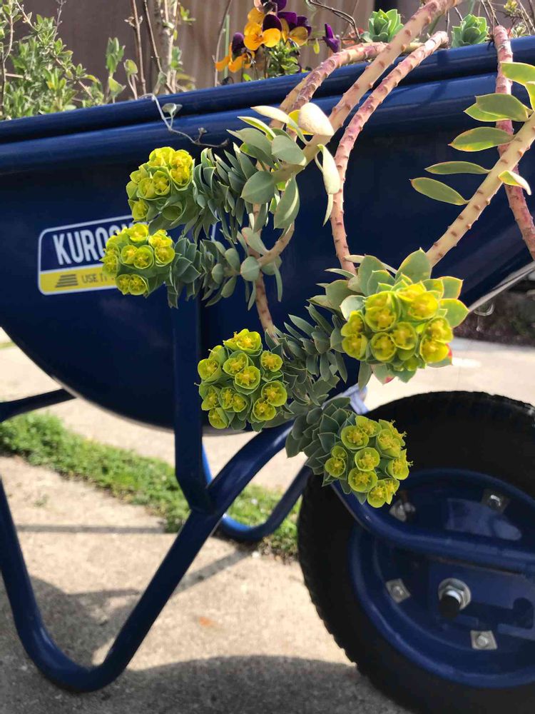 ユーフォルピアミルシニテス。青い一輪車に映えてます、綺麗な色だなぁ(*´▽`*p♡q