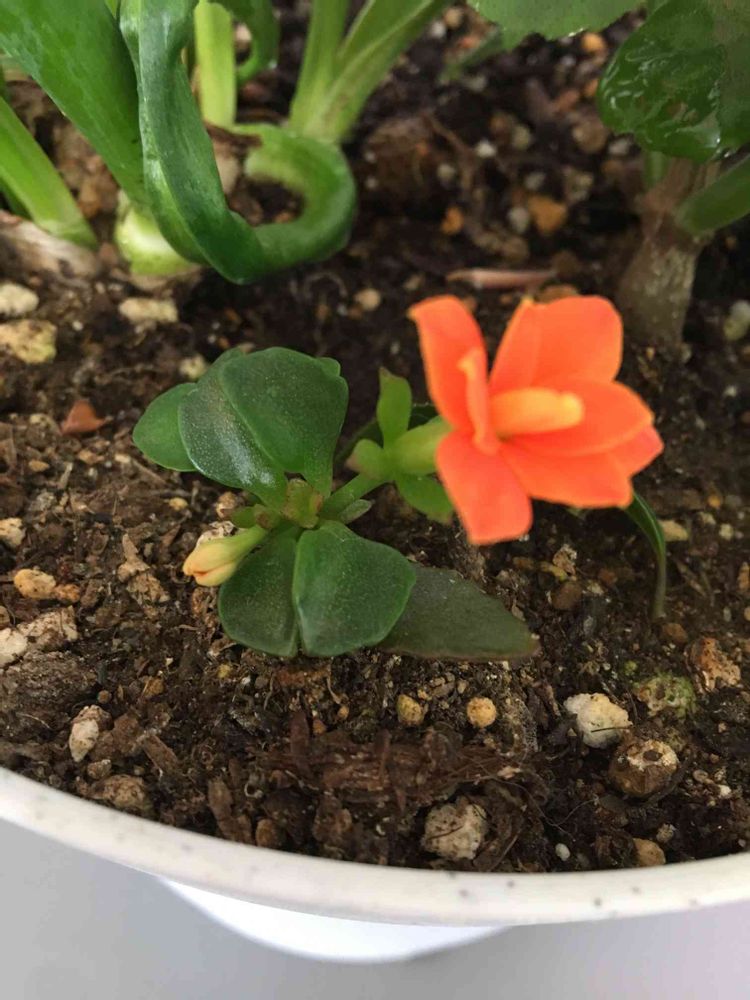 挿し芽したカランコエが、こんなにチビちゃんですが、綺麗なお花を咲かせました❣️