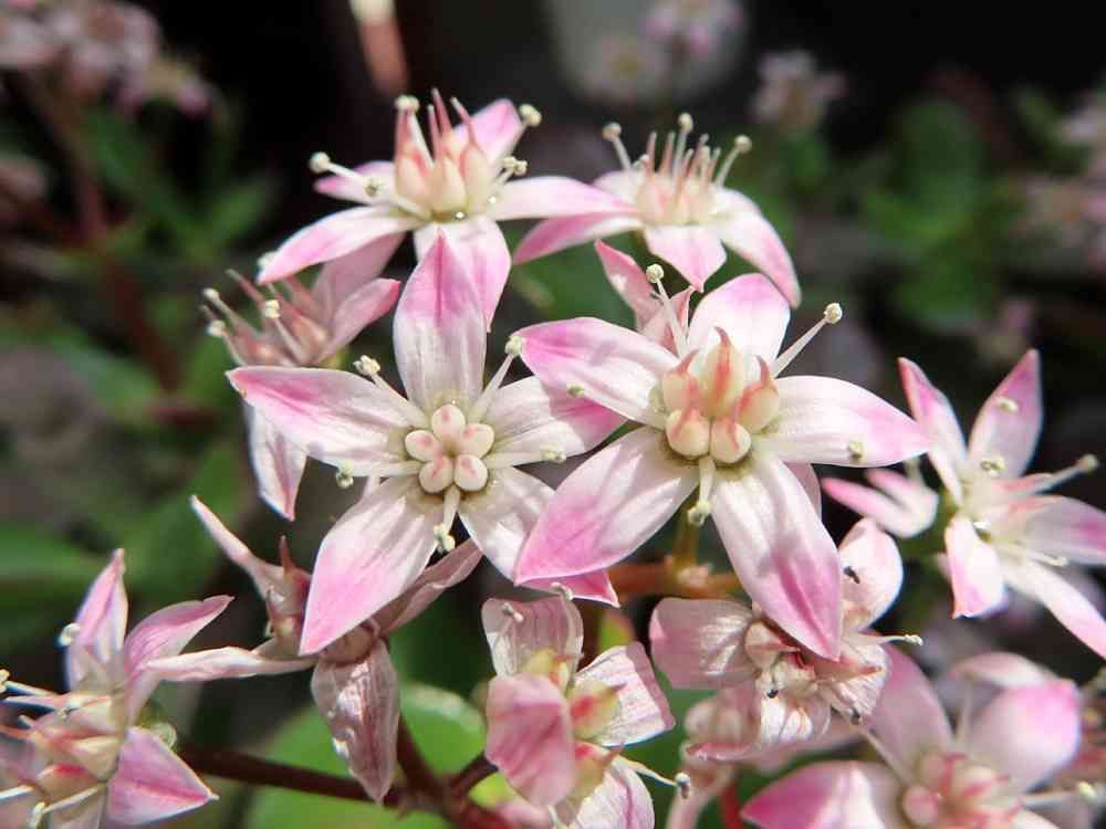株が成長すると茎頂に花序を出し、星形の小さな白い花かピンク色の花が密集して咲く。