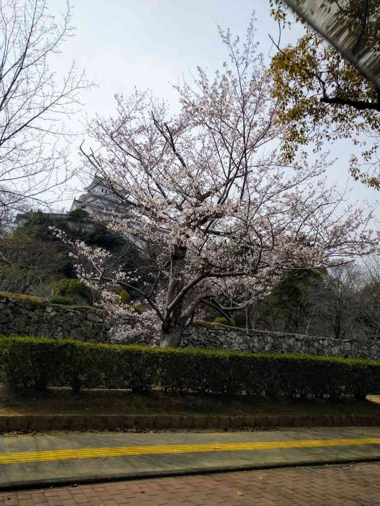 姫路城の裏側に 一本だけ早く咲く桜🌸の木が 車の助手席から撮りました🌸