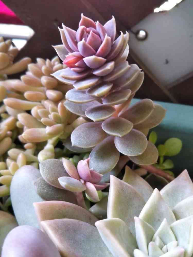 節操のないプランターから大きな花芽が上がっておりました。親御さんが他のコに埋もれて徒長で何だか分からず…。多分葉の形と花の色でパールフォンニュルンベルグさんだと思います。もうとっぺんが子株ちゃんになっておりました…😺