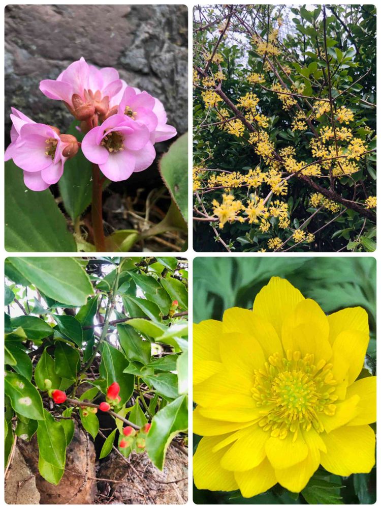 ピンクのヒマラヤユキノシタから右周りに山茱萸 福寿草 木瓜😊
