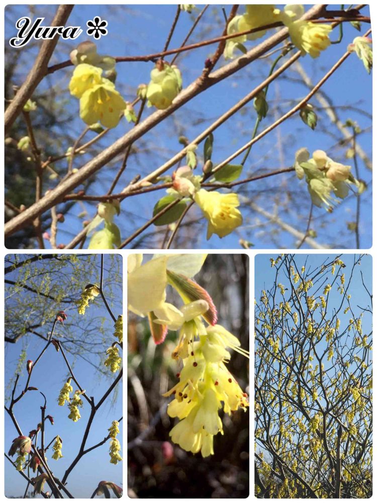 早春に淡い黄色の垂れ下がるように咲くお花🌼