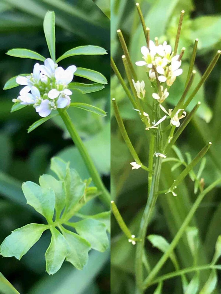 良く似た、在来種のタネツケバナとの、見分けポイントは、生える場所、花の大きさ、花と実の高さ、茎の毛、らしいですよ。