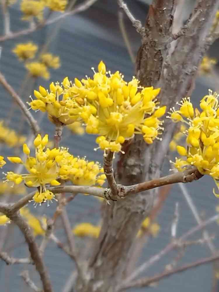 庭のサンシュユの花が咲き初めました。何かたまごのそぼろに似ておいしそう!