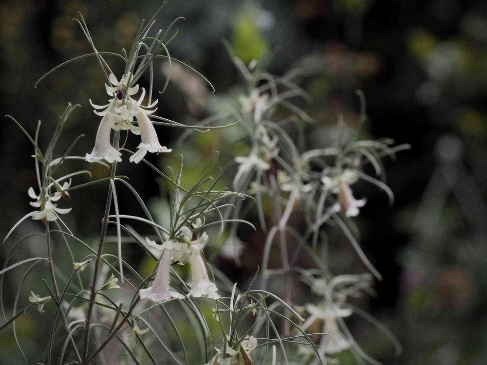 エレモフィラっていうとニベアっていう紫色のお花が有名なんだけど、この子はラッパ型で白なんだ。面白いでしょ😁