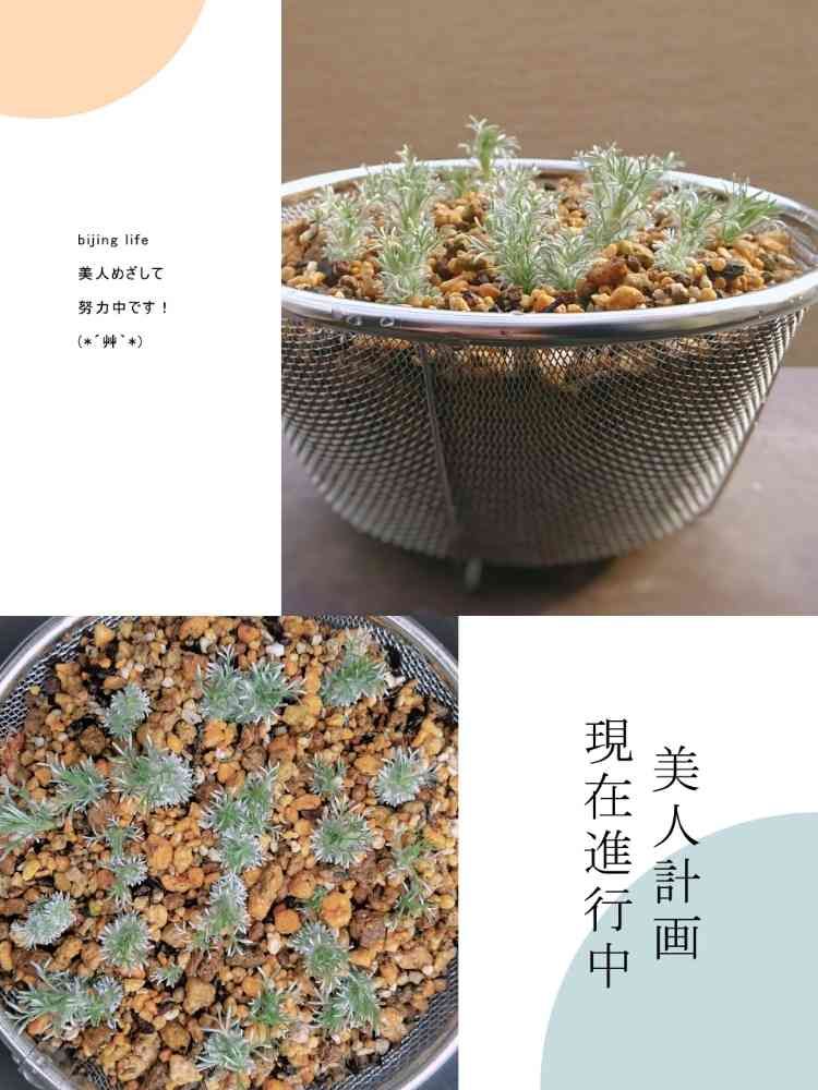 考えあぐねた挙句「ザルに植える」という新しい試みに辿り着きました。モコモコを目指して。
