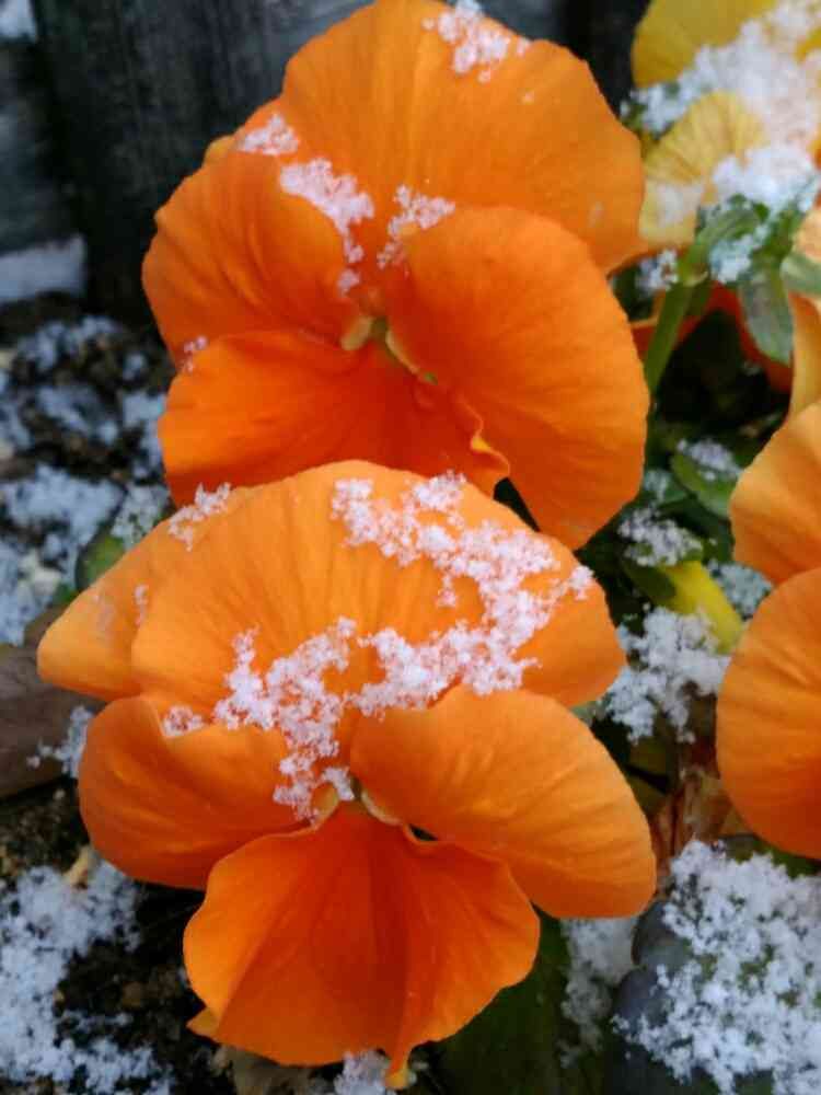 オレンジのビオラに 雪は☃️