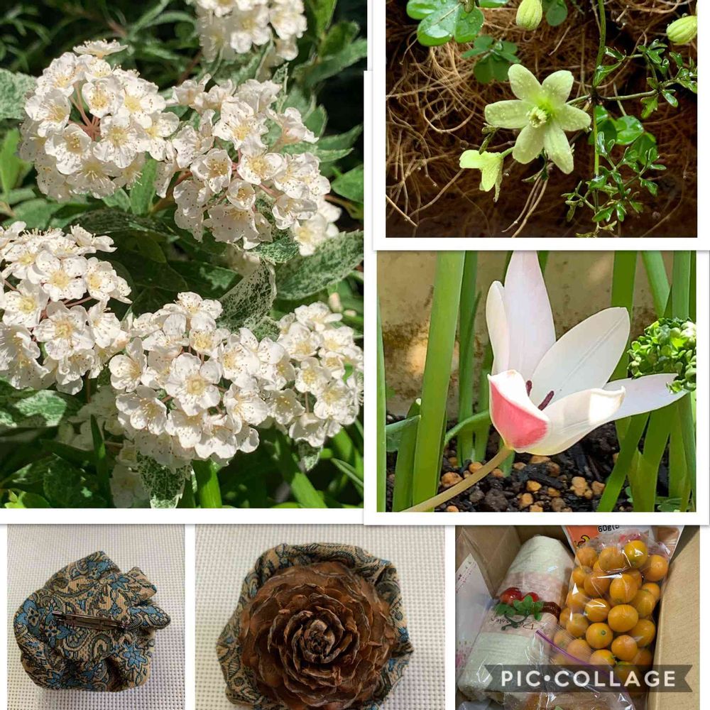 シダーローズの松ぼっくりを沢山拾った花友さんに手作りのブローチをご紹介しました!とてもシックな布を選んでありますが私が作った訳ではありません😅