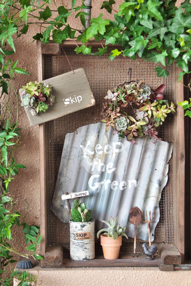 ベランダガーデンのシンク上部分です^^ダリアボックスを立て掛けて、そこに植物や雑貨を飾って楽しんでいます♪新入りさんは、ウチワサボテン!とっても可愛いです♥リメ缶に植えて、ピックもつけてみました^^