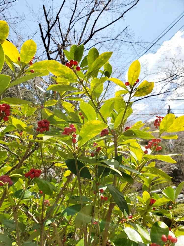 庭園のミヤマシキミが赤い実を沢山付けていますがこのこは毒性があるため、鳥さんもよく知ってるのか食べに来なくて綺麗です。私にすれば助かりますが?