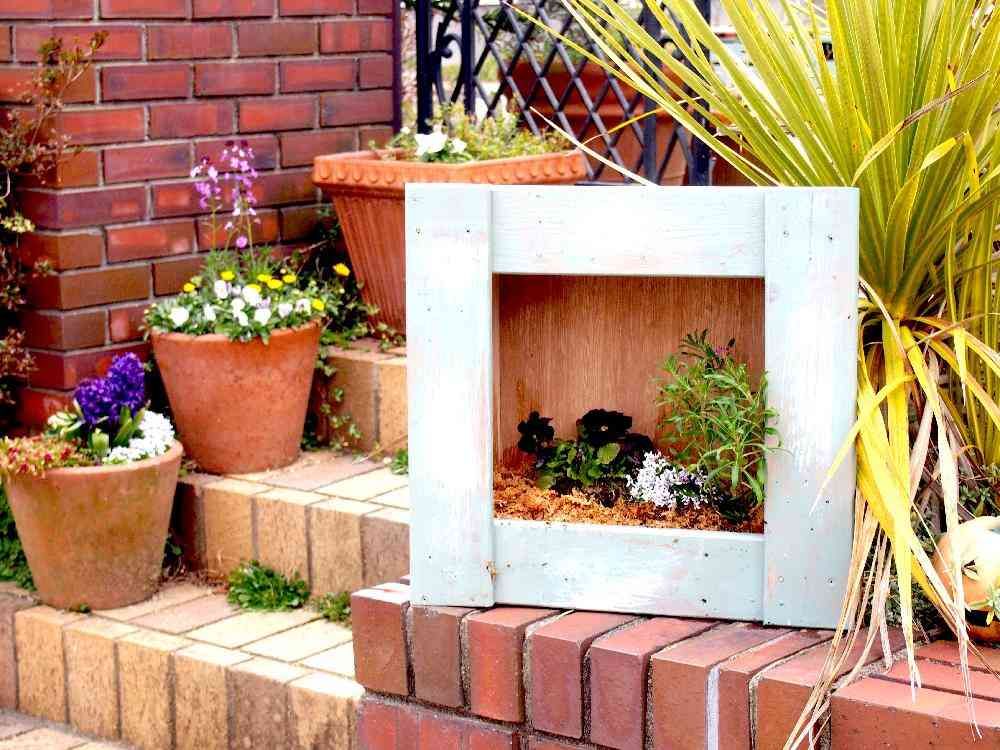 すのこを使って自分で額縁ハンギングを作って、その中にパンジーとイオノプシユームとチェイランサスを植え込んでみました、もうちょっと成長すると中のお花の絵も変わってくるので楽しみです。