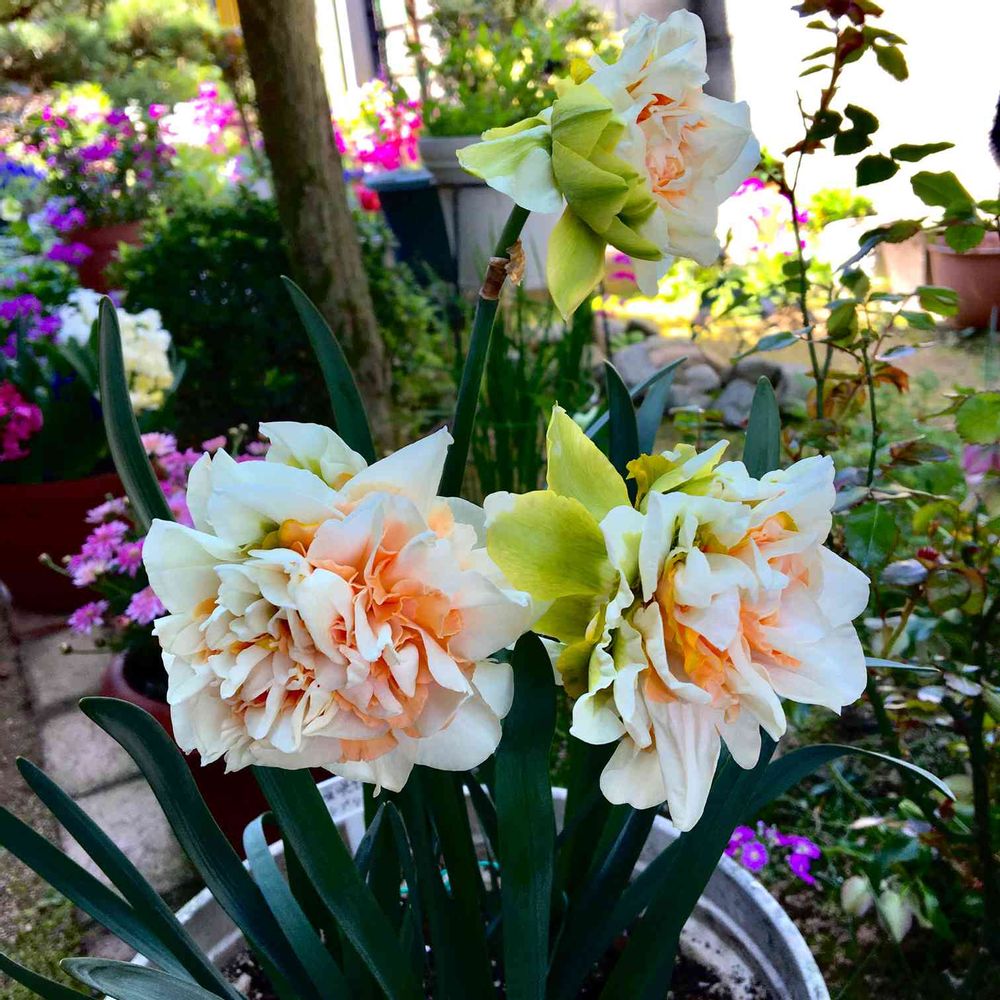 こんにちは☀️八重咲き水仙❣️グラデーションの色合い💕すばらしいですネ〜🙆♀️今日はネコ🐱ちゃんいない😅寂しい😔