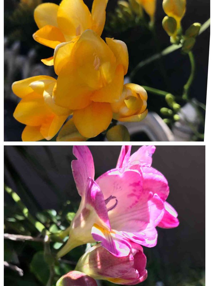 ご近所で可愛いフリージアが2色咲いていました。