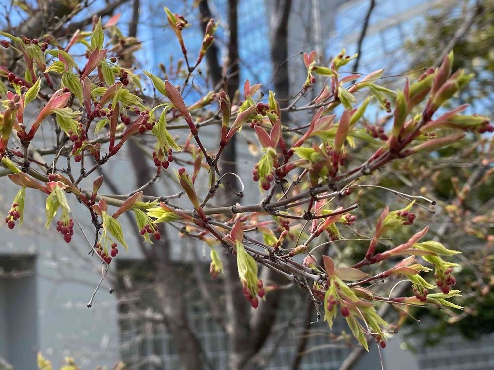 公園のイロハモミジ 春にはこんな花が咲くのですね(いままで紅葉しか意識してなかった、、)
