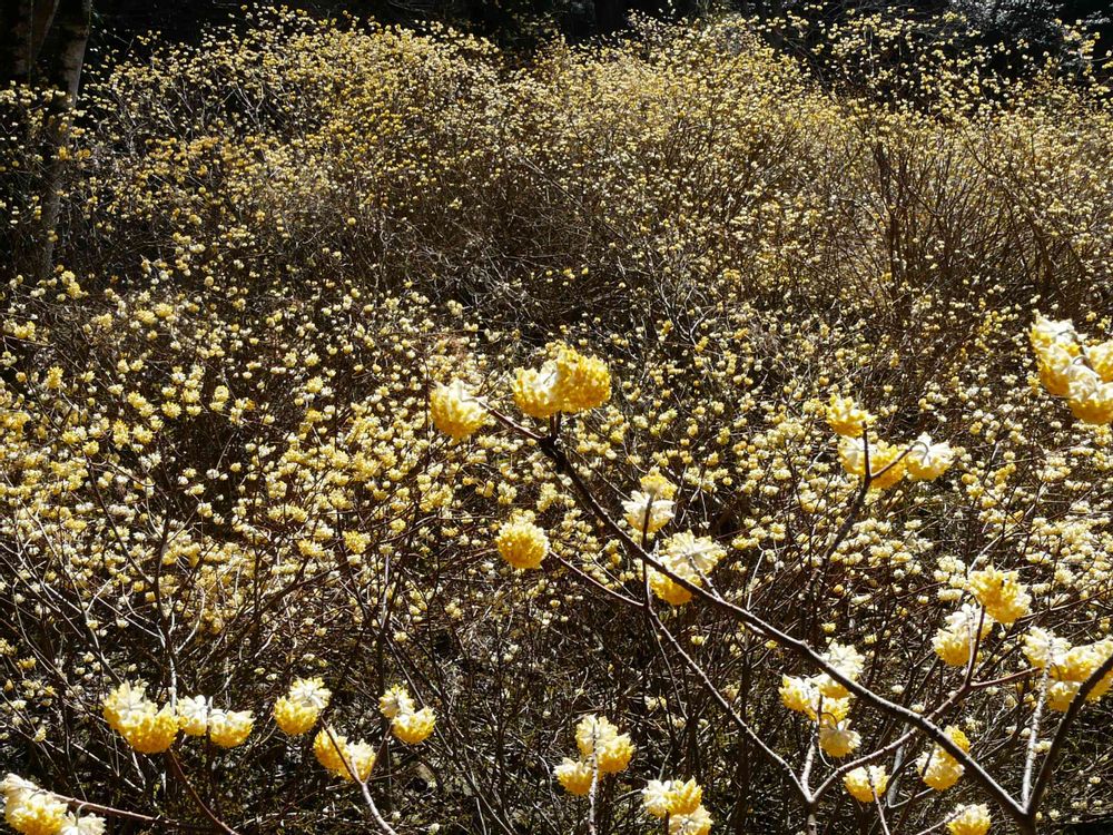 日曜日にミツマタの群生地に行ってきました。50年以上前に和紙の原料として栽培されていたものが、時代の移り変わりと共に利用されなくなり、現在では谷いっぱいにまで生息域を広げてるようです。駐車場から歩いて10分、谷沿いに一面黄色の花が咲き誇って、見事というほかありません(*^^*) ただただ息をのんで見つめるだけでした(((^_^;) 手入れをされてる方、本当にご苦労様ですm(__)m