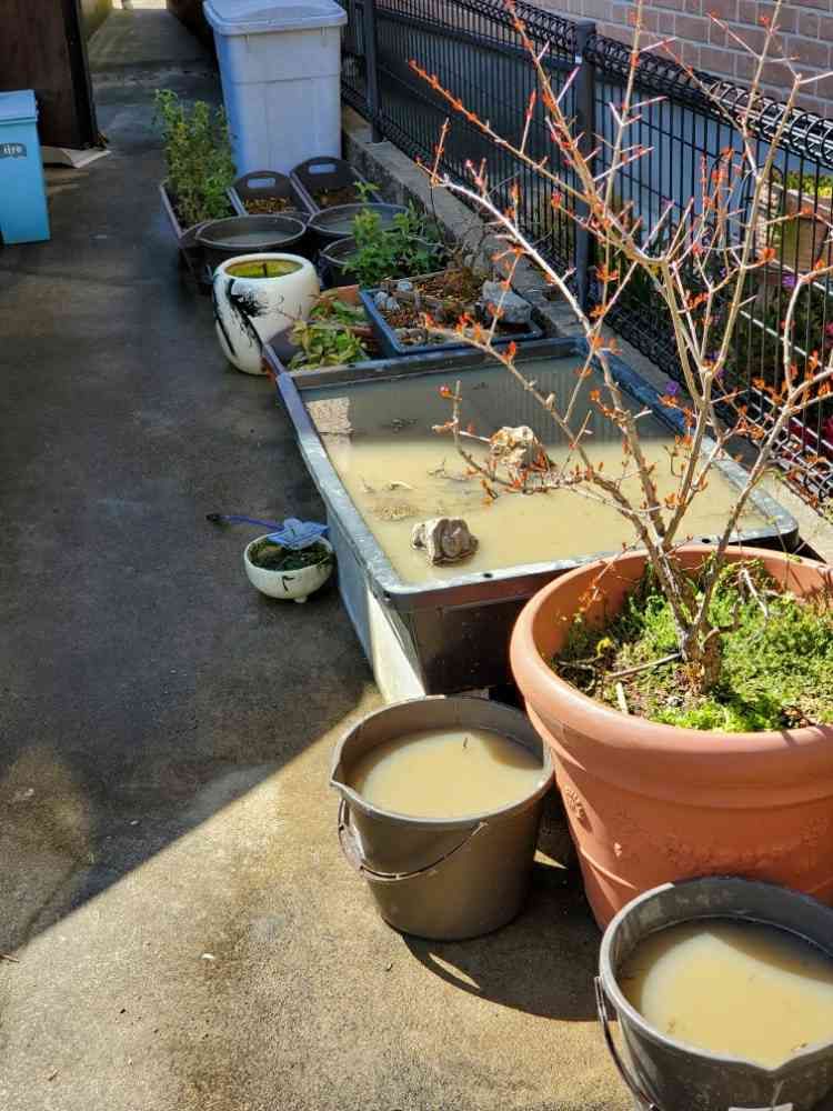 100均でバケツを五個買ってきて、小さめの蓮根を植え付け、トロ舟には大きな苗を4本。