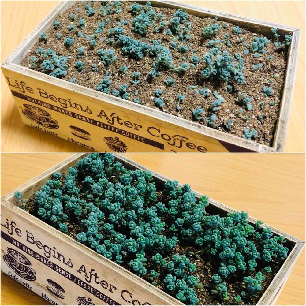 成長シリーズ🌱姫星美人👸春にはモケモケの絨毯に‼️でもなかなか増えないなーと思ってて、比較したら半年で、こんなにも増えてた👍冬の間も何気にしっかり成長してくれます😊