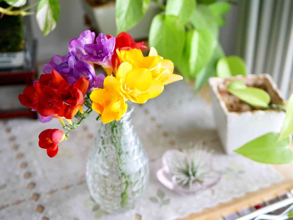 ベランダで育てている八重咲きフリージアを切り花にして飾っています😊