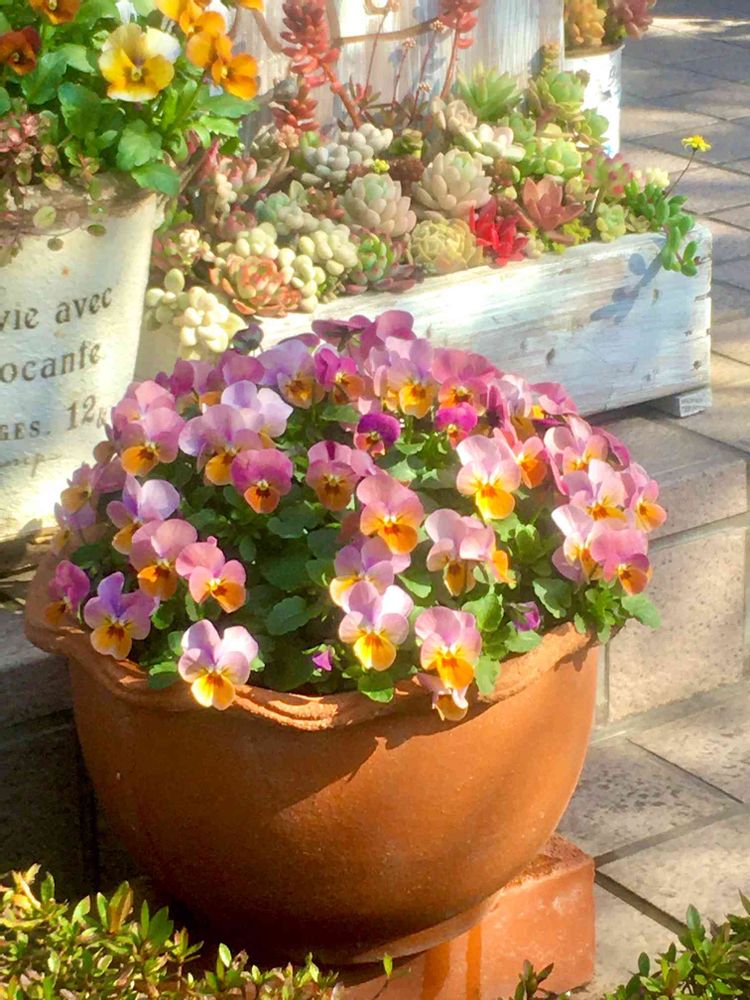 ぷっくり鉢に似合う可愛いビオラさんですね💕