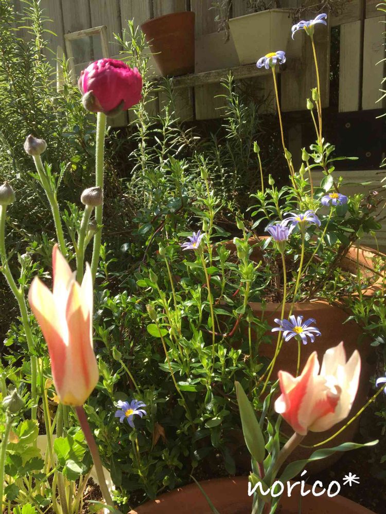 珍しい角度からの写真だね♡植えっぱなしチューリップなんてのもあるんだね〜✨ラナンキュラスもついに花芽が上がってきたんだね💕