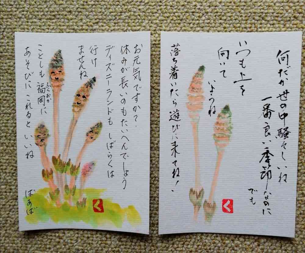 お孫さんへの土筆の家族、可愛いですね💕。ご友人への土筆に込められた文も素敵で✨。くまちゃん さんの絵手紙シリーズ大好きです❤️