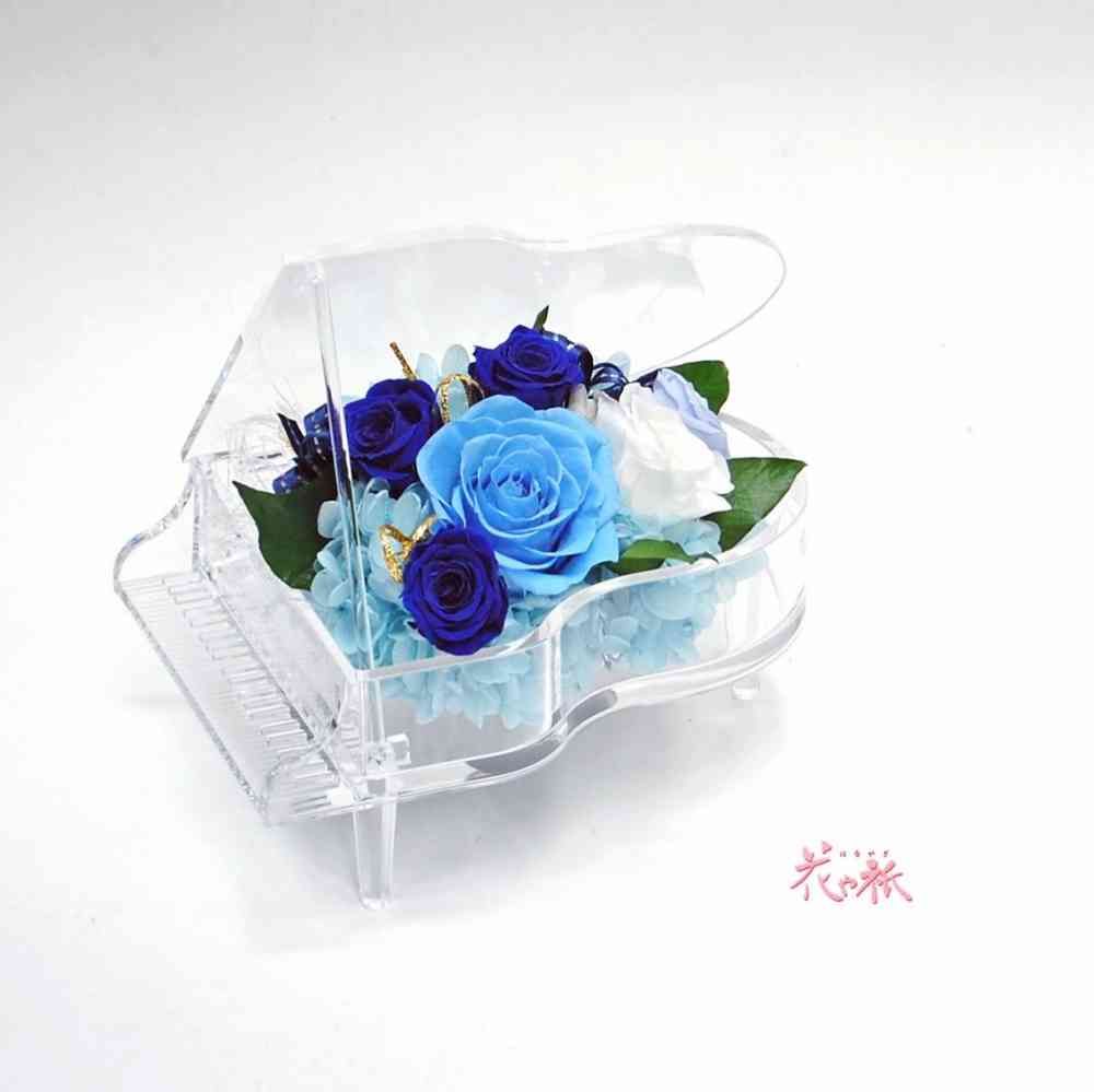 クリアなグランドピアノに、青い薔薇のプリザーブドフラワーをアレンジいたしました✨