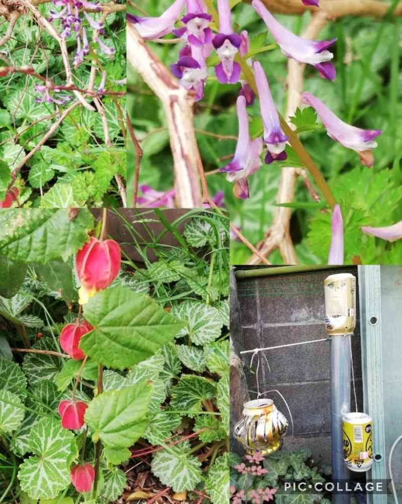上の花 雪ノ下と チェリーセージの 根元から 生えている 草の花 いつもはむしり取っているけど よく見ると 可愛いので 残しました 右下は 金属音を 地中に響かせ モグラよけの 仕掛け 効果なし😅 左下 まだ色の薄い チロリアン