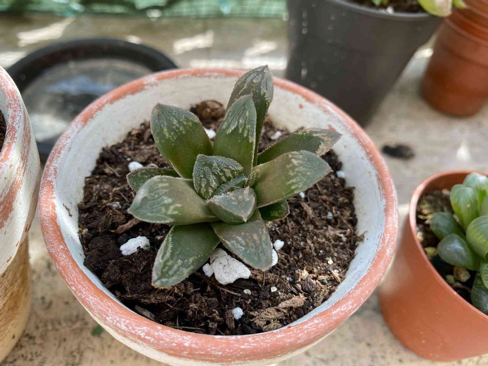 仙人(このハオルチアの親株育ててた人)が玉扇とオブツーサのミックスで最高の出来って言ってたけどたしかに窓の模様が魅力的😊❤️