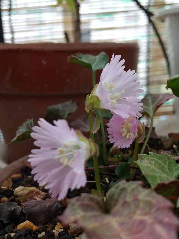 東京は曇り空、少し肌寒い朝です。ベランダで岩うちわ咲きました〜可愛いピンク色です。🥰