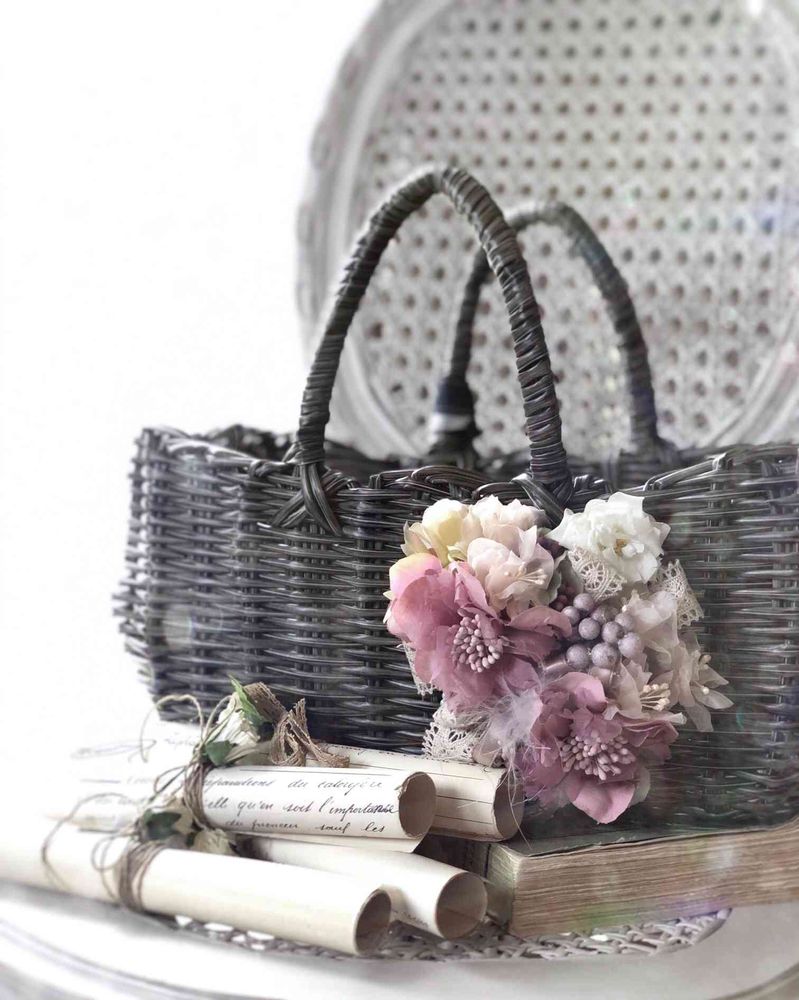 コサージュとかごの色合いがマッチしていて素敵!このかごも手づくり〜凄い〜おしゃれ💞