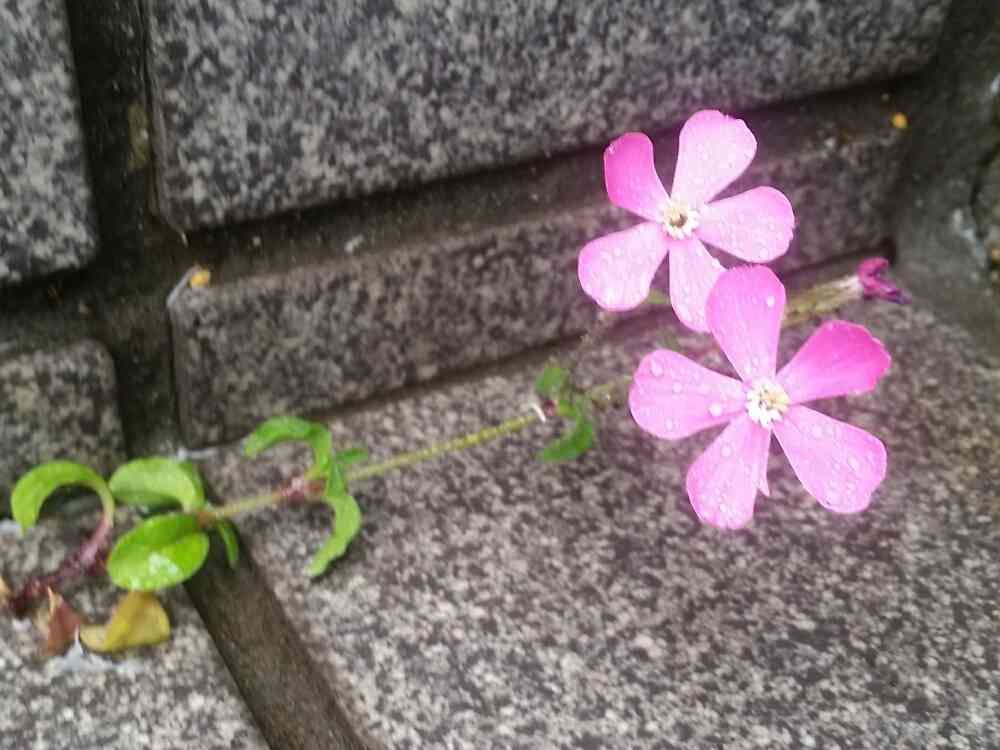 お隣さんの花壇よこのタイル張りのわずかな隙間に種が溢れたのか、鳥などが運んできたのか。ピンク色の可愛らしい5弁の花びらが印象的です。