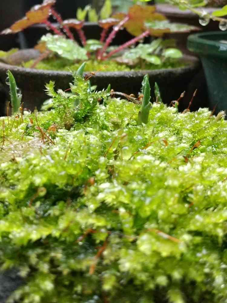 雨の中、苔から芽を出したギボウシ(^_^)v