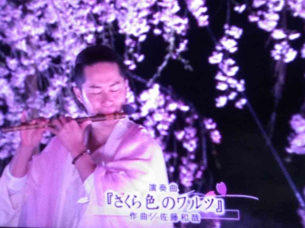 TVの生中継、垂れ桜🌸の前、☂️の中で篠笛演奏が素敵でした。