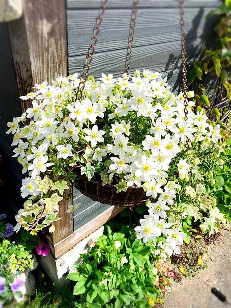 クレマチスにこんな色があるのですね✨しかもハンギングにしてるの初めて見ましたよ👀素敵です💕