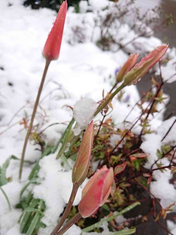 ひぇ〜❄チューリップさん、寒そう〜🌷ホントに雪降ったんですね❄