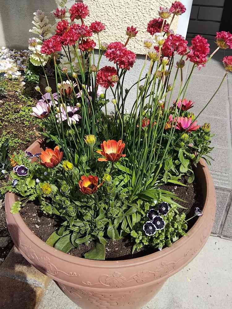 素敵な寄せ植えで、伸びしろを、考えて余裕ある植えつけが、良いですね。