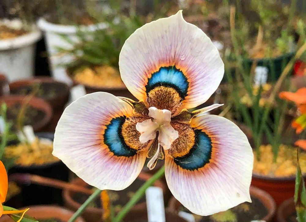 オレンジ色のモレア ツルバゲンシスと紫色のモレア ビローサを交配して育てたら、こんな花が咲きました。初めての花です!。青緑の模様がキレイです✨✨。