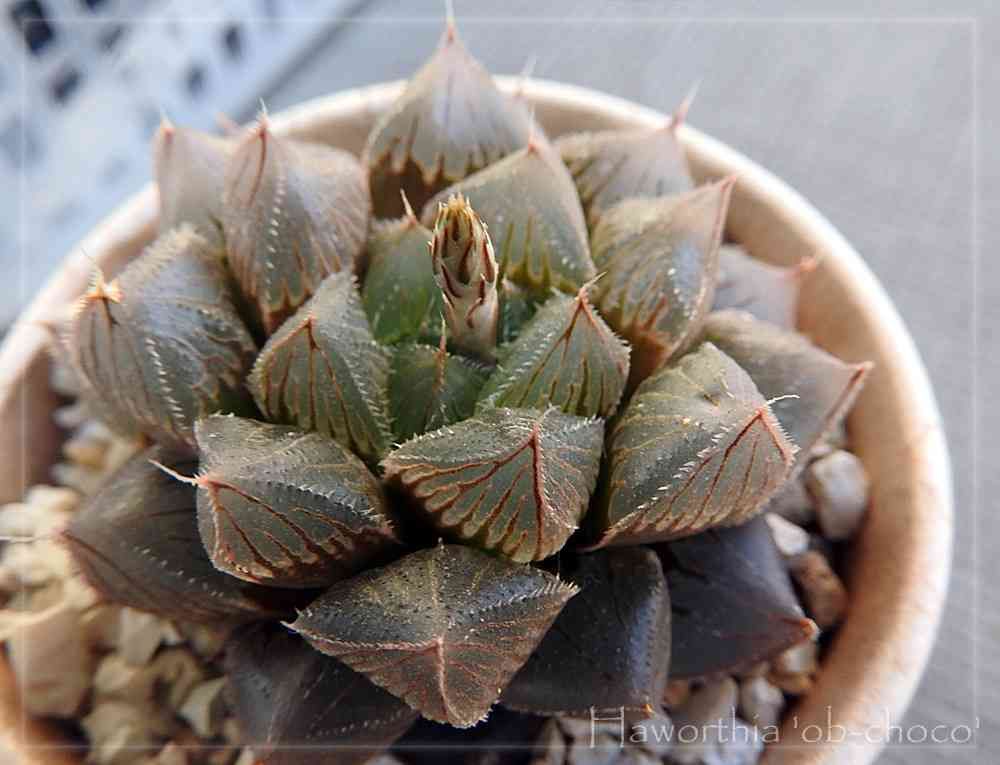 ハオルチア、オブチョコ。花芽がにょきっ! 葉の色もチョコレートっぽいし、ふっくらしてるし、なかなかきれい。他のハオルチアは春の日差しのせいで軒並み日やけ気味だけど、チョコレート系はいい時期です。
