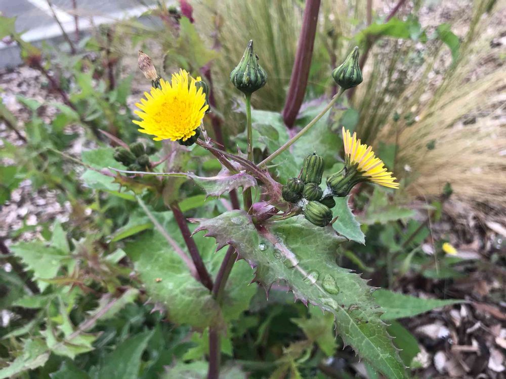 スーパーの駐車場脇の植え込みで咲くノゲシ。たくましさに脱帽です。