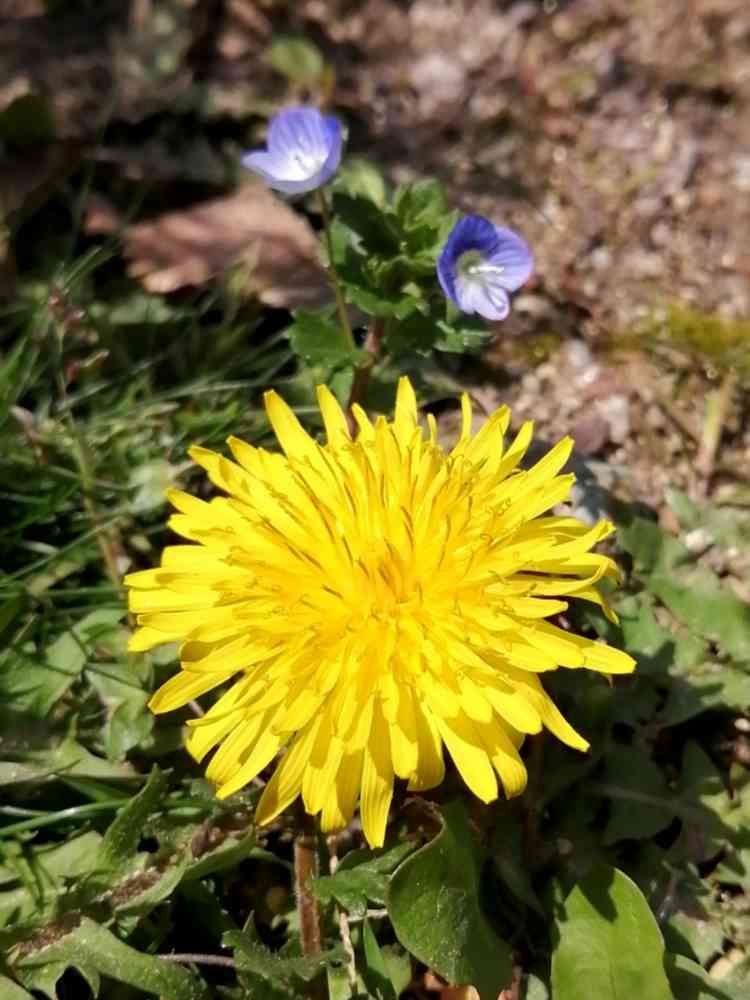 春ですね、足元にはタンポポとフグリが共演してました。