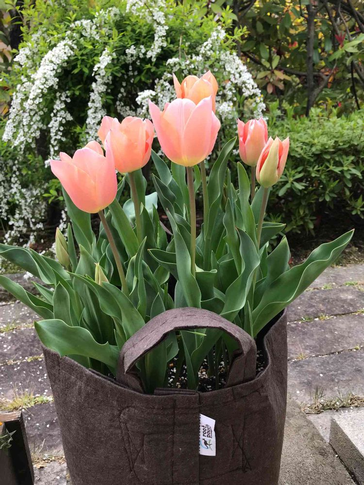 不織布プランターのチューリップが咲き始めました。サーモンピンクがかわいい💕