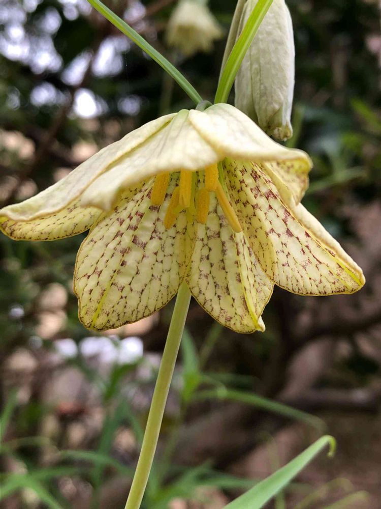 今日は❗バイモユリは和名では編笠百合とも言いますね、花の中が編笠見たいな模様が有るのでそう呼ばれてます。