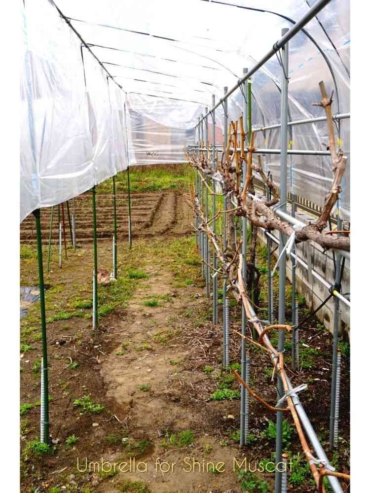 と言う訳で、葉芽の発芽前に、ビニール覆いを完了した。しっかり、雨から守ってやる。美味しいブドウの大収穫、ヨロシコ❗